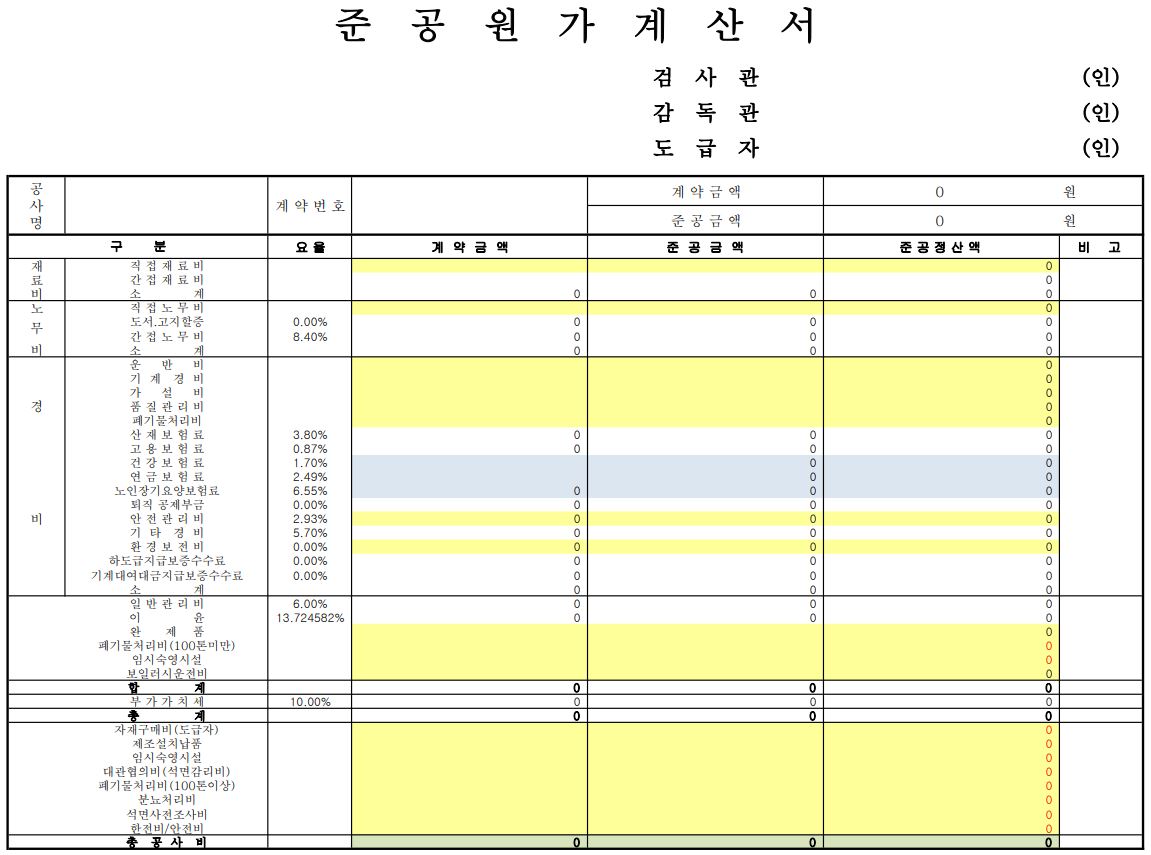 준공원가계산서 자동계산 엑셀 양식을 무료로 배포합니다.